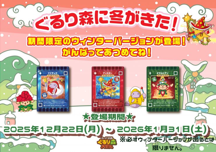 ~カード迷路ぐるり森大冒険「ウィンターバージョン」登場~ 2025年12月22日(月)より ぐるり森大冒険に季節限定「ウィンターバージョン」カードが登場します! 登場期間は以下の通りです。 期間限定ですのでぜひ、ゲットしてください♩ ◆登場期間:2025年12月22日(月)~2026年1月31日(土) ◆登場カード:全3種類